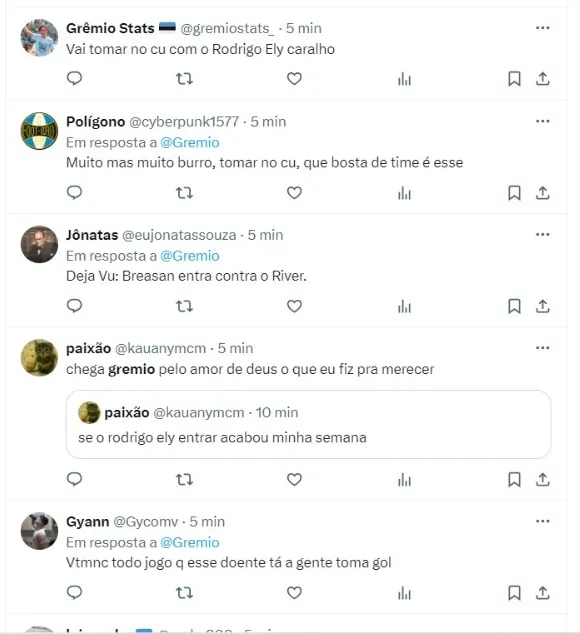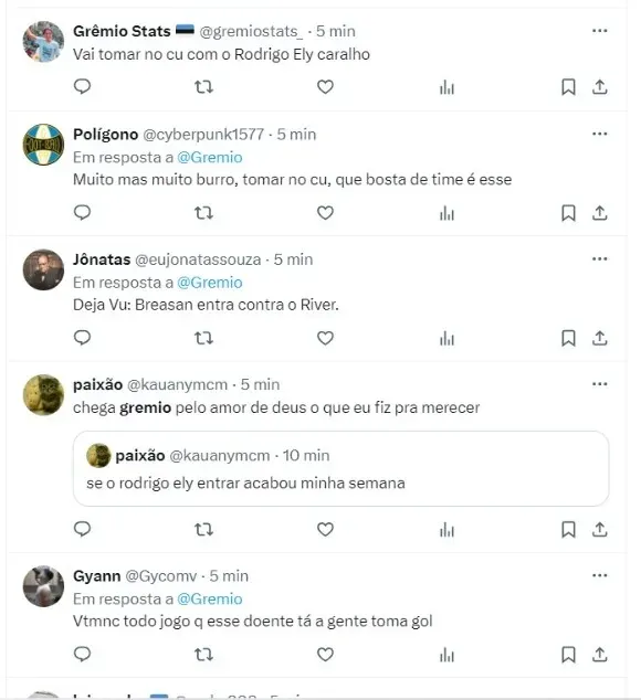 “Rodrigo Ely combina com o star+ sempre atrasado 10 segundos” – “A Libertadores não tá pro Grêmio. É inacreditável. Vem Rodrigo Ely no jogo mais decisivo do Grêmio nesse ano. É muito azar“, escreveram alguns torcedores nas redes sociais.