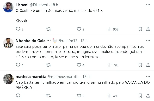 Nessa interação, o torcedor comentou uma publicação feita pelo atacante do América-MG, ironizando a eliminação do Coelho diante do Galo na semifinal do campeonato. Varanda, então, desafiou o torcedor para uma aposta de R$ 1.000, em um tom desafiador.