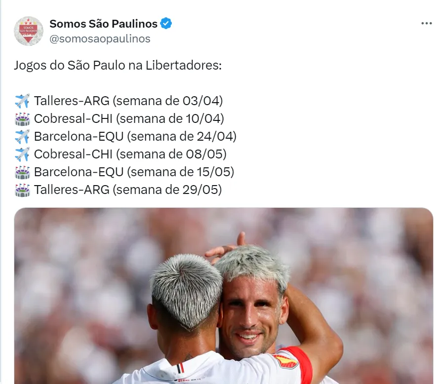 “O São Paulo também (pode se complicar) com o Barcelona, que é o único nos últimos cinco anos, fora de Brasil e Argentina, que chegou nas semifinais duas vezes. O Talleres sempre incomoda”, disse Roger, do SporTV, em texto publicado pelo Torcedores.com.