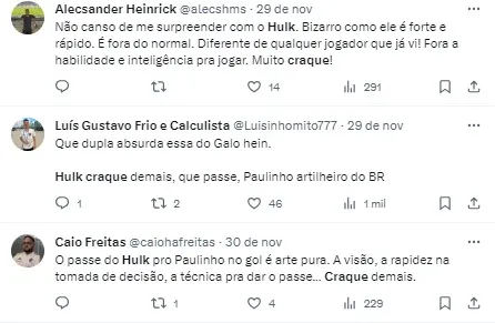 “Esse resultado é mérito de todos. Pés no chão. Nosso objetivo é a vaga direta na Libertadores. O que vier, é extra. Estamos plantando, e vamos colher daqui dois jogos”, disse Hulk.