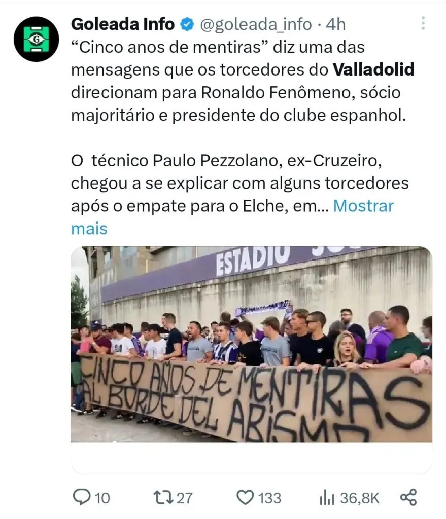 Se a situação do Cruzeiro não é das melhores no Brasileirão, competição a qual ocupa a 12ª colocação e não vence há oito rodadas, ainda mais problemática é a situação de Ronaldo Fenômeno, dono da SAF do Cruzeiro, com o Valladolid, outro clube em que é mandatário. O clube empatou em 1 a 1, no último domingo (10) e também vive uma sequencia ruim, já que venceu apenas um dos seus últimos cinco jogos da Segunda Divisão Espanhola.