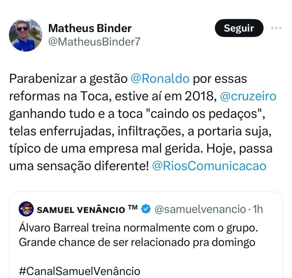 “Nicolás Larcamón disse que ainda espera um ponta-direita. Cruzeiro segue fazendo contatos e dentre os vários nomes que o clube está procurando, tem quem está livre no mercado e também a possibilidade de buscar atletas que estão atuando no Brasil, podendo assim fazer o registro até 19 de abril”, concluiu.