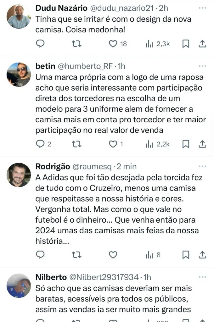 “Sonho todo dia com a Nike no Cruzeiro, na real mesmo. O contrato da Adidas é um lixo e sem contar da falta de respeito com o clube e o torcedor. Nike pra já”, disse um internauta.