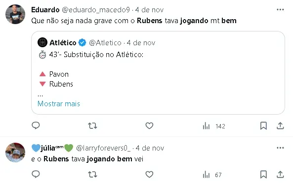 O meia Rubens, do Atlético-MG, ainda é uma dúvida para o próximo jogo contra o Corinthians devido a um choque de cabeça sofrido no jogo anterior contra o América-MG.