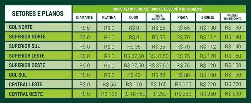 A tabela divulgada pelo Palmeiras de preços tem os seguintes setores, veja quais são os valores e os descontos no ingresso para planos de sócio torcedor dos diferentes planos do Avanti, e os preços para torcedores comuns estão nos “valores sem desconto”. Estes valores valem apenas para torcedores do Palmeiras: