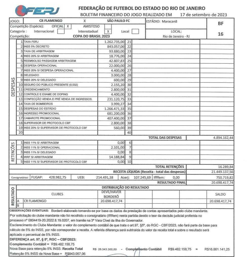 A partida entre Flamengo e São Paulo no Maracanã, pela Copa do Brasil 2023, teve uma das maiores rendas do futebol brasileiro. Mas, segundo o jornalista Rodrigo Capelo, da TV Globo, o valor está “inflado” e os números mostrados no telão não existem. Veja top-10 das maiores rendas do futebol brasileiro em jogo entre clubes e o valor real arrecadado pelo Flamengo na partida: