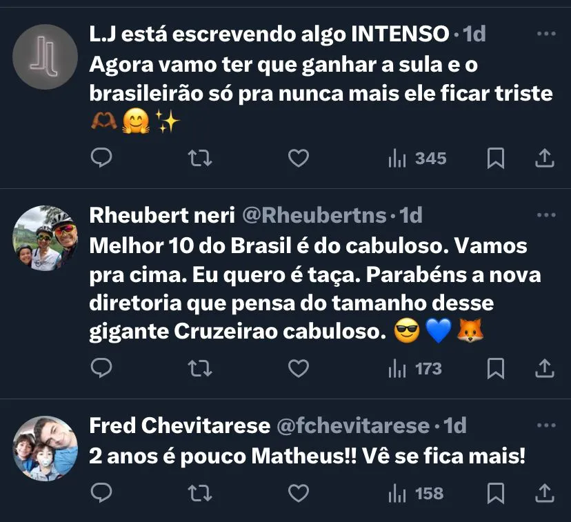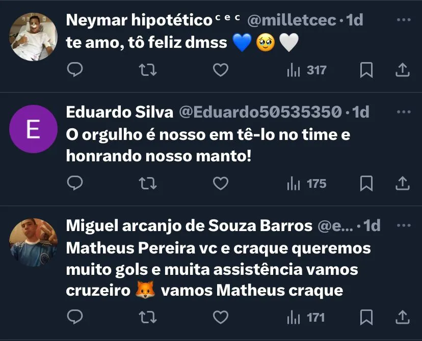 A torcida do Cruzeiro está muito feliz com a contratação em definitivo de Matheus Pereira, um dos principais jogadores da equipe na temporada, com seis gols e nove assistências. Além de ser um dos melhores meias do futebol brasileiro na temporada.