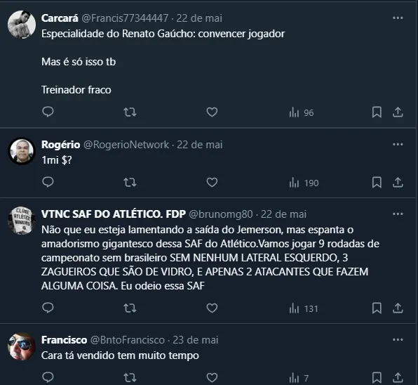 Antes de Jemerson, nomes como Patrick, Edenilson e Pavón já haviam saído. Inclusive, três dos quatro nomes se transferiram para o Grêmio, responsável direto pelo “respiro” financeiro do Atlético-MG.