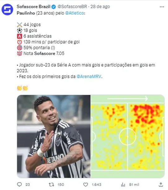 Porém, os números do jogador apontam para feitos notáveis, já que Paulinho é o vice-artilheiro do Atlético na temporada, com 18 gols marcados. O camisa 10 também cravou seu nome na história atleticana ao ser o primeiro a balanças as redes na recém-inaugurada Arena MRV.