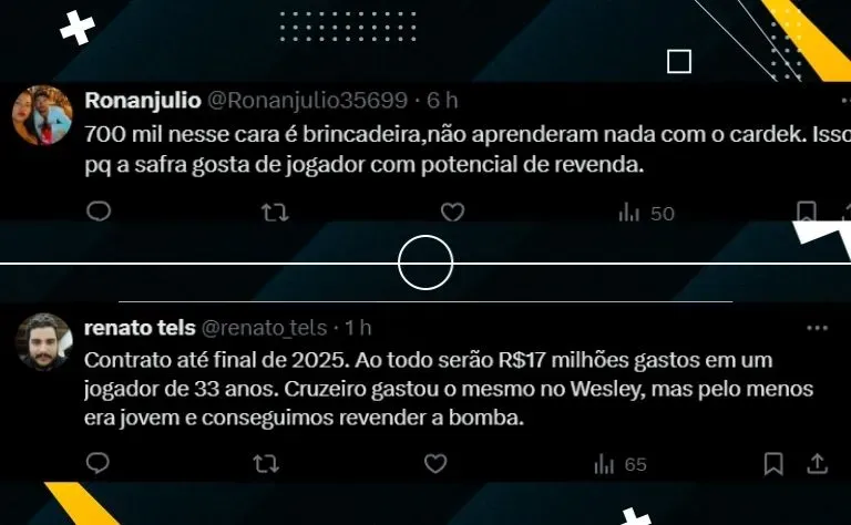 “Nem se fosse isso mesmo eu estaria comemorando, pode até queimar minha língua, até torço por isso, mas pra mim é uma péssima contratação”, escreveu um torcedor do Galo no X, antigo Twitter.