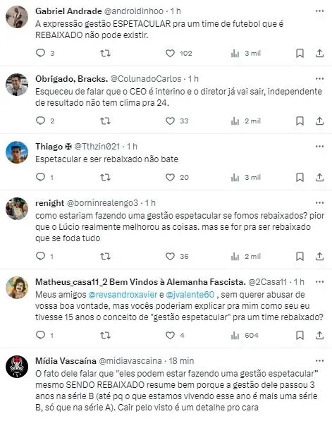 Neste contexto, Salgado está apontando que o atual executivo de futebol, Paulo Bracks e o CEO da SAF, Lúcio Barbosa, são os primeiros a serem mandados embora, caso o pior aconteça na Colina. Tal fato, está no regimento da gestão vascaína.