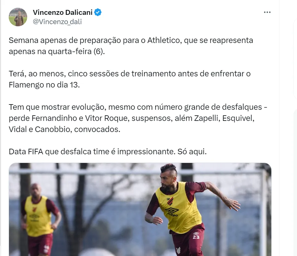 Muito criticado pela torcida, Wesley Carvalho ganha uma pausa para trabalhar a equipe em função da Data Fifa. O Athletico só volta a campo no dia 13 de setembro (quarta-feira), às 21h30 (de Brasília), contra o Flamengo, no Estádio Kleber Andrade, em Cariacica. Porém, o treinador tem uma péssima notícia para o confronto com o time de Jorge Sampaoli.