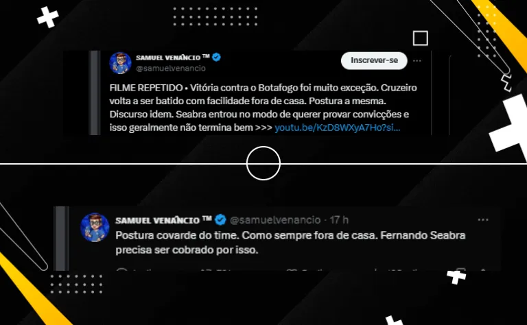 “Postura covarde do time. Como sempre fora de casa. Fernando Seabra precisa ser cobrado por isso. Vitória contra o Botafogo foi muito exceção. Cruzeiro volta a ser batido com facilidade fora de casa. Postura a mesma. Discurso idem”, reclamou Venâncio.
