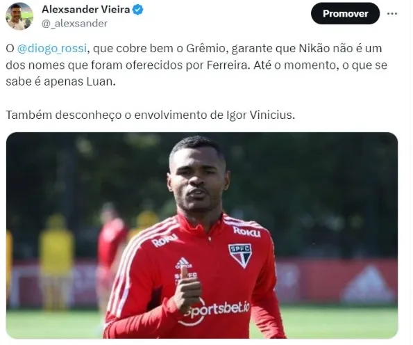 A reportagem apurou que não existe a possibilidade do lateral-direito ser incluído no negócio, já que faz parte dos planos de Dorival Júnior, bem como da diretoria tricolor paulista.