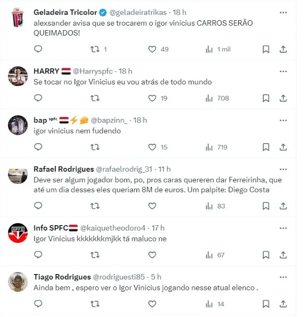 Outros nomes estão sendo tratados, mas ainda não houve confirmação da nossa reportagem. Alguns sites colocaram que Igor Vinicius estaria entre os debatidos para ir para o Grêmio.