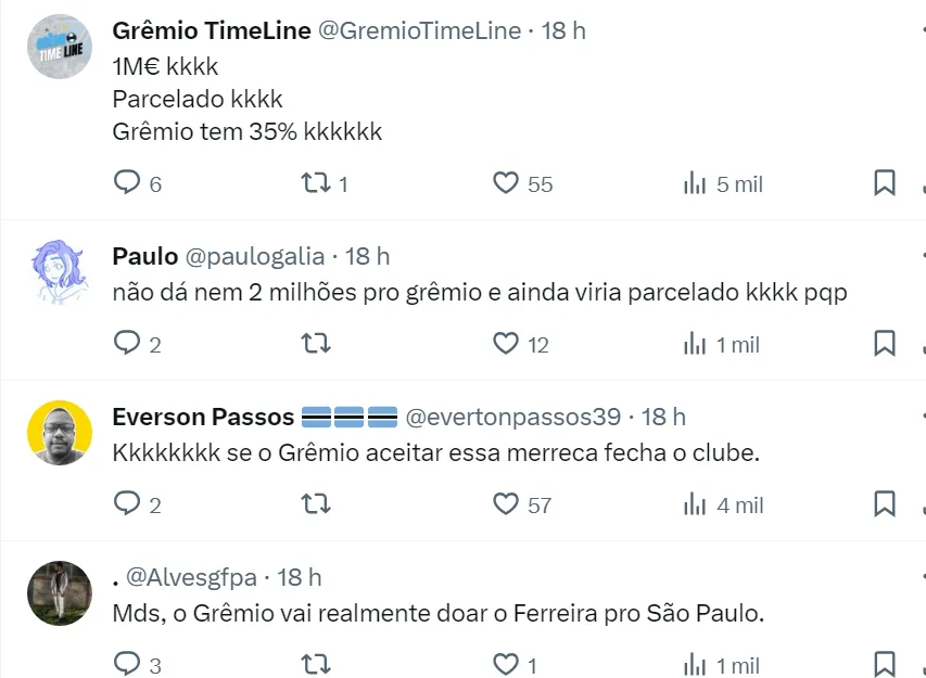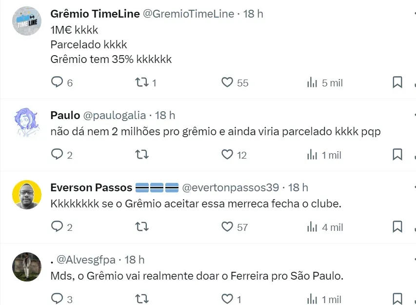 Vale lembrar que o Tricolor Gaúcho tem apenas 35% dos direitos econômicos do atleta, outros 55% pertencem ao próprio Ferreirinha e ao seu empresário, e o restante estão ligados a um clube do Mato Grosso do Sul.
