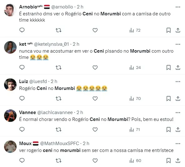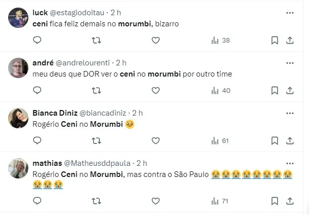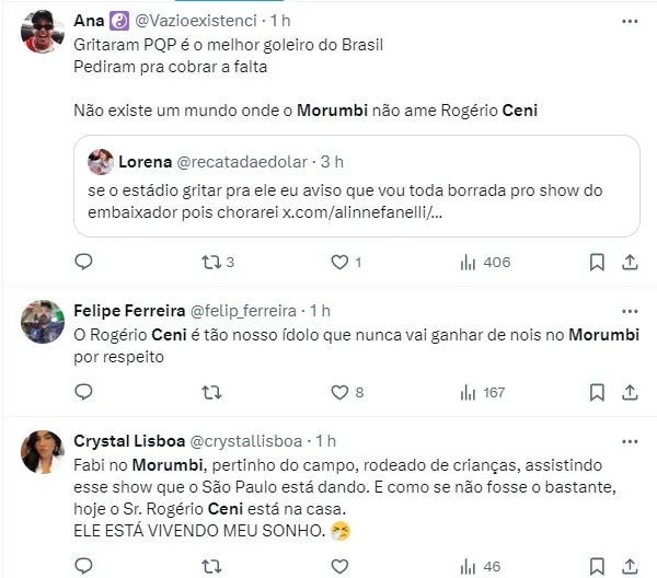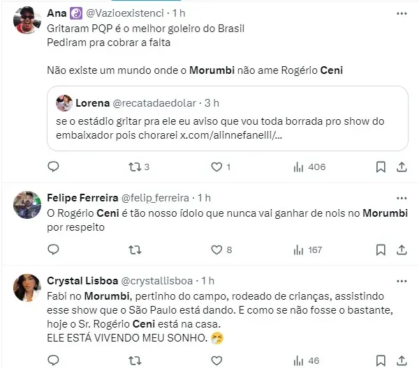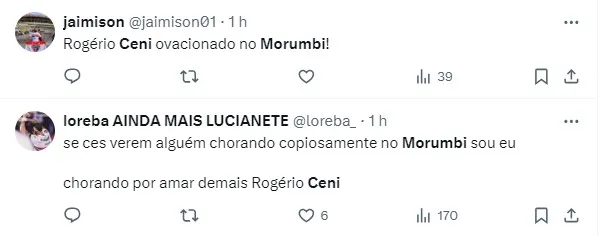 Em resposta, a torcida do São Paulo presente no estádio ovacionou o ex-goleiro e treinador são-paulino, mesmo como adversário, e não foi diferente nas redes. Veja as reações dos são-paulinos nas redes sociais com o reencontro com Rogério Ceni no banco de reservas adversário: