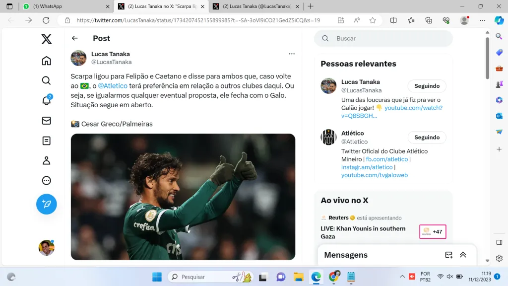 Um dos nomes que ainda é ventilado na Cidade do Galo é o de Gustavo Scarpa. O meia de 29 anos está em baixa na Europa e acenou com uma volta ao Brasil. Neste ínterim, o Atlético se mostrou o principal interessado, a pedido de Felipão, que trabalhou com o craque na época do Palmeiras.