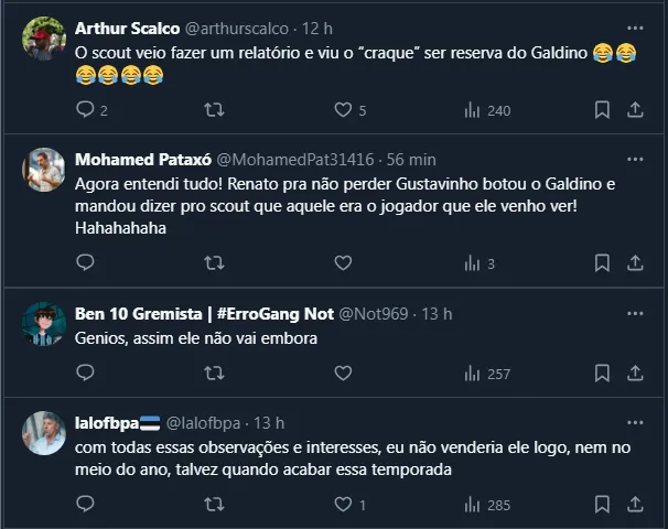 Após realizar uma boa Copinha, o jovem de 18 anos passou a ser mais utilizado e já vem sendo monitorado por europeus. Inclusive, de acordo com informações do setorista Kaliel Dorneles, o scout do Manchester United (ING) esteve na Arena no último jogo e o atleta começou no banco, o que dividiu a torcida.