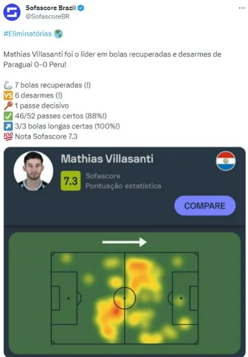O Mathias Villasanti atuou no duelo da seleção paraguaia diante do Peru. Apesar do empate sem gols, o jogador do Grêmio foi importante no confronto e foi o líder em bolas recuperadas e desarmes da Seleção do Paraguai. De acordo com o site Sofascore.