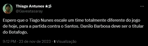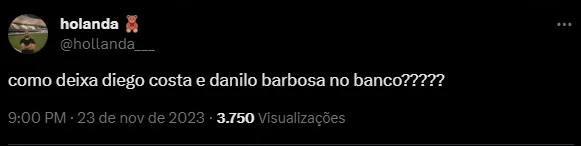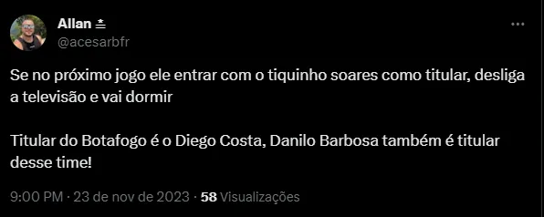 “Se Danilo Barbosa e Diego Costa não forem titulares domingo eu nem vejo o jogo!!!”, “Como deixa Diego Costa e Danilo Barbosa no banco?????” e “Titular do Botafogo é o Diego Costa, Danilo Barbosa também é titular desse time”, foram alguns comentários.