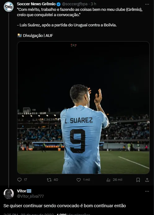 Com a despedida marcada do Grêmio em dezembro, Suárez expressou sua determinação em continuar representando a seleção uruguaia. “Vai ter Luís até quando der. Até que não se sinta capaz de ajudar a seleção no que for”, concluiu o centroavante.
