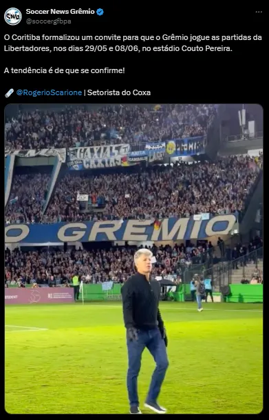 A diretoria do Coritiba ofereceu o Couto Pereira para que o Imortal dispute suas duas partidas pela fase de grupos da Copa Libertadores da América. Vale destacar que o Paraná também fica na região do Sul do país, então é um deslocamento menor do RS.