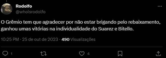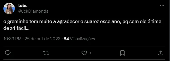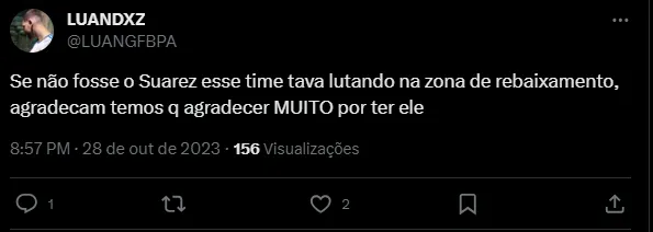 “Se não fosse o Suarez esse time tava lutando na zona de rebaixamento, agradecam temos q agradecer MUITO por ter ele” e “o Greminho tem muito a agradecer o Suarez esse ano, porque sem ele é time de z4 fácil…”.
