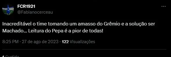“Sempre a mesma coisa, coloca Machado no time. Porque o Fernando Henrique não entra? Bruno Rodrigues no meio de campo? Pede pra ir embora Pepa”, “Inacreditável o time tomando um amasso do Grêmio e a solução ser Machado… Leitura do Pepa é a pior de todas!” e “Machado não acrescenta NADA em campo bicho. Não defende, não ataca, não organiza. Simplesmente não dá pra entender o ‘tesão’ do Pepa nesse cara”, foram algumas da reações.