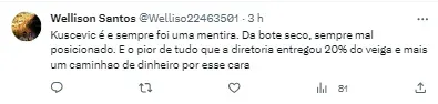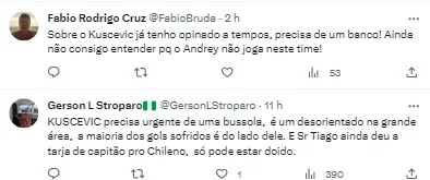“Kuscevic está mais perdido que cego em tiroteio” , “Kuscevic é pior que Bruno Viana que foi rifado por muito menos quando estava numa fase melhor que o chileno. “, “Nunca vi muita vontade no Kuscevic, a garra que vemos nos chilenos não vejo nele.” , “Kuscevic falhou muito, mas muito mais do que Bruno Viana.“ , “Sobre o Kuscevic já tenho opinado há tempo. Precisa de um banco.” , “Kuscevic precisa urgente de uma bússola. É um desorientado na grande área, a maioria dos gols sofridos é do lado dele” , “E como recompensa, ganha uma faixa de capitão. Koskoski tá ou não perdido?”, “O Kuscevic é e sempre foi uma mentira. Dá bote seco e sempre mal posicionado.” , “Um dos piores zagueiros que já vi vestindo a camisa do Coritiba”, publicaram alguns torcedores do Coritiba.