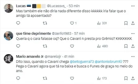 “Cavani vem de muito tempo jogando na Europa e as mudanças e adaptações são difíceis para os jogadores. Até onde sei, ele não fez uma pré-temporada e isso gera um desgaste. Porém, creio que o ano que vem será espetacular porque é um atleta incrível e que foi bem em todos os clubes que passou“, disse o uruguaio.