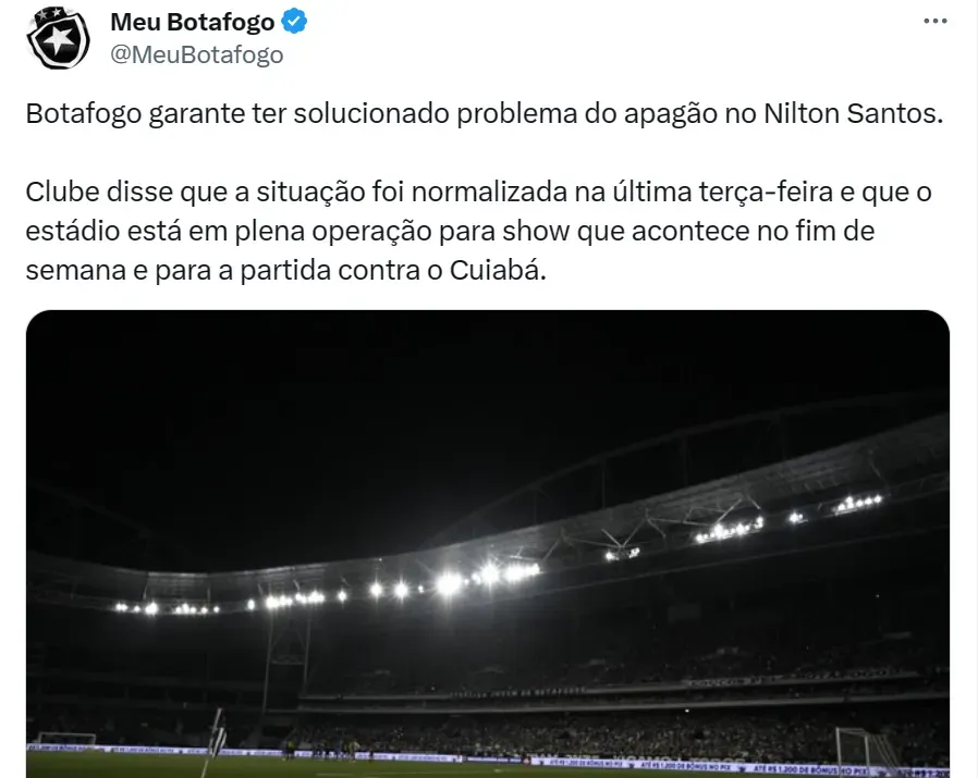 Nesta quarta-feira (25), o Botafogo informou à imprensa, todavia, que os problemas foram totalmente solucionados no Nílton Santos. Desta forma, o estádio encontra-se em plena operação para o show de Roger Waters, no próximo sábado (28). Por consequência, tudo estará normalizado para o jogo contra o Cuiabá, no dia seguinte, às 20h (horário de Brasília), pela 30ª rodada da Série A.