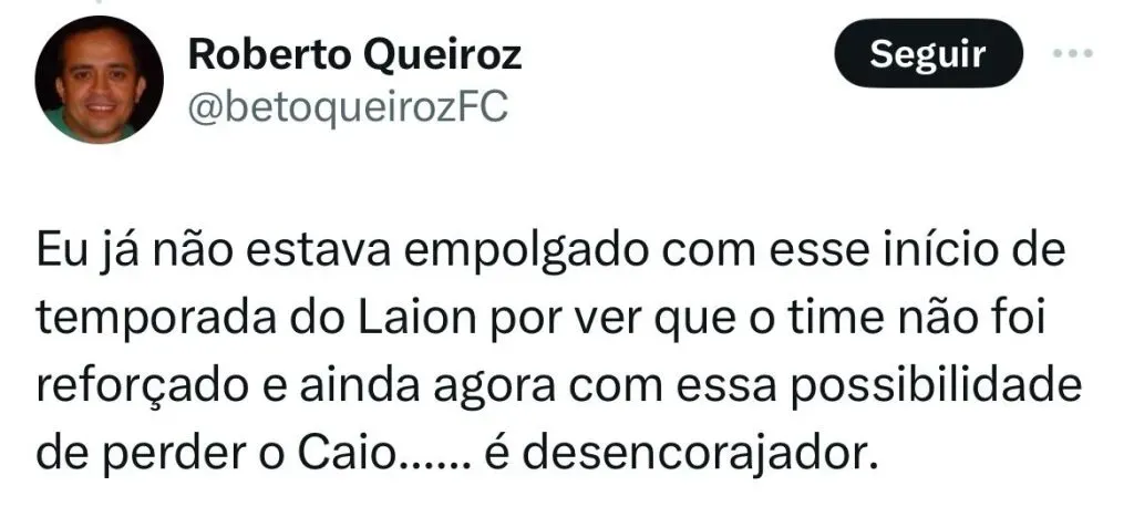 Porém, um volante que é de confiança de Vojvoda pode estar de saída do Leão. Isso porque nas últimas horas, o Palmeiras voltou a carga para tirar o jogador Caio Alexandre, do Fortaleza nos próximos dias. De acordo com apuração do Ge, Verdão ainda não chegou a um acordo financeiro com o Leão do Pici, e as tratativas ficaram arrastadas, mas Anderson Barros tentará esquentar o negócio nas próximas horas.