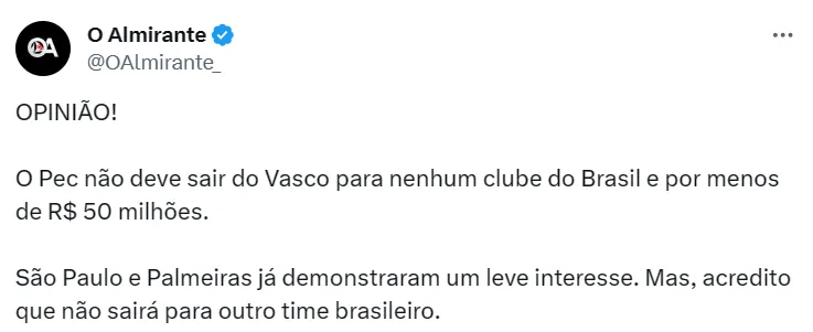 O Vasco não se pronunciou sobre o caso até o momento, nem mesmo o jogador falou a respeito. O contrato de Pec com o Gigante é válido até dezembro de 2027 e seu valor de mercado é de 3 milhões de euros (R$ 16 milhões) segundo o Transfermarkt.