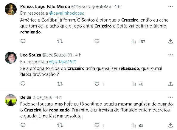 Após a derrota do Cruzeiro para o Flamengo por 2 a 0, na noite da última quinta-feira, a torcida celeste manifestou sua preocupação nas redes sociais. Com o clube na 15ª colocação do Campeonato Brasileiro, apenas um ponto acima da zona de rebaixamento, os torcedores expressaram temores de reviver o pesadelo de 2019, quando o Cruzeiro foi rebaixado pela primeira vez em sua história. A situação delicada do time nas últimas rodadas aumentou a apreensão dos fãs, que esperam por uma reação imediata da equipe.