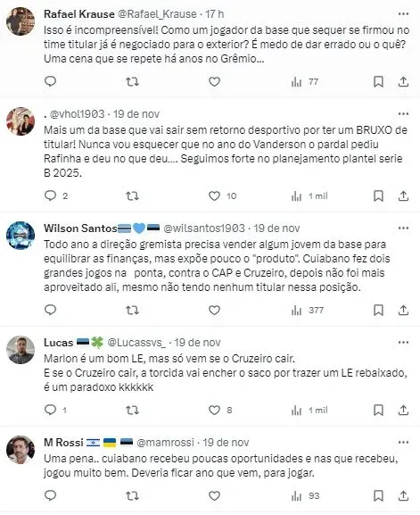 Neste contexto, a situação de Cuiabano chama atenção, já que o jovem lateral foi promovido recentemente por Portaluppi e suas atuações no primeiro ano de equipe principal, já despertaram o interesse de times da França, Turquia, Itália e Portugal, além de Botafogo e Athletico-PR. As informações são do Portal do Gremista.