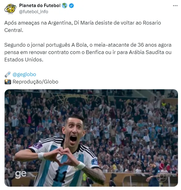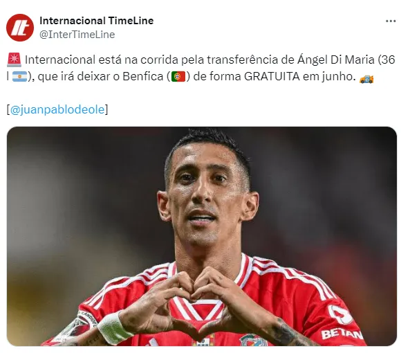 No entanto, a tendência é de que o argentino não venha para o futebol sul-americano. O possível destino de Di María seria renovar com o Benfica ou se aventurar em outras ligas, como na Arábia Saudita e Estados Unidos.