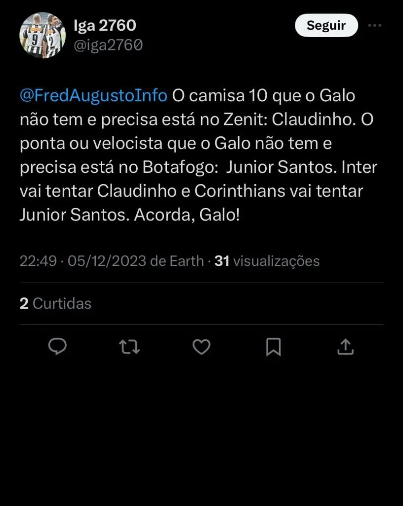 Na web, a torcida do Galo pediu a contratação do jogador de 26 anos, que passou pelo Bragantino antes de ir para Rússia: “O camisa 10 que o Galo precisa e não tem está no Zenit, o Claudinho”, disse.
