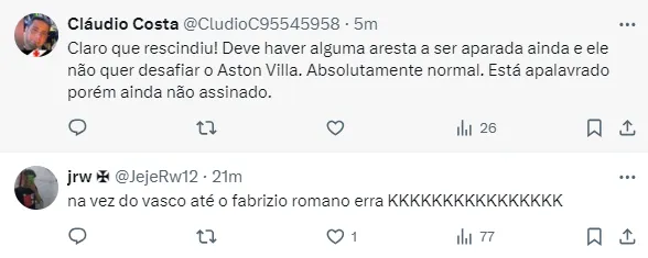 Os torcedores estão comentando muito nas redes sociais sobre a declaração. Um torcedor, em tom de brincadeira com a situação, comentou: “acabou a tinta da impressora”, em alusão à hora de imprimir o contrato.