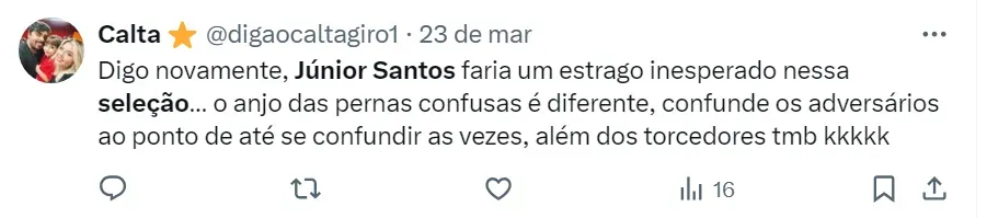 De acordo com o comentarista, Júnior Santos e outros atletas do futebol brasileiro merecem ser observados pelo treinador do Brasil. Outros jogadores citados por ele foram: Mayke, Zé Rafael e Raphael Veiga, do Palmeiras, Léo Pereira e Pedro, do Flamengo, e Paulinho, do Atlético-MG.