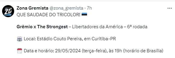 O Grêmio está retornando ao futebol depois de quase um mês parado devido a situação das enchentes. O tricolor terá compromissos na Libertadores hoje (29) contra o The Strongest no Couto Pereira, no dia 4 contra o Huachipato fora de casa e no dia 8 como mandante contra o Estudiantes.