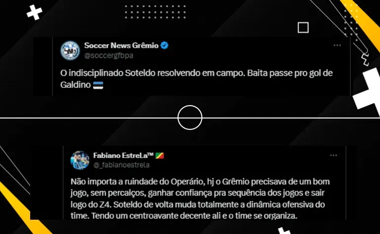 “Não importa a ruindade do Operário, hoje o Grêmio precisava de um bom jogo, sem percalços, ganhar confiança para sequência dos jogos e sair logo do Z4. Soteldo de volta muda totalmente a dinâmica ofensiva do time. Tendo um centroavante decente ali e o time se organiza”, ponderou outro gremista.