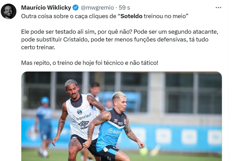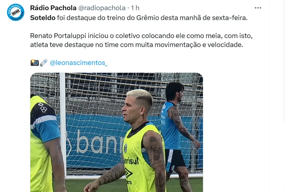 Nesta sexta-feira (12), a atividade comandada por Renato mostrou pontos interessantes e Soteldo foi o centro das atenções. Segundo o portal GZH, Renato utilizou o jogador primeiramente como meia, mais centralizado.