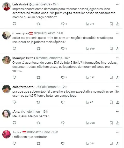 Entretanto, o Colorado tem problemas em relação aos atletas que estão afastados. Nesse contexto, o técnico Eduardo Coudet não quer criar expectativas sobre os respectivos retornos, que podem reforçar a equipe em um momento intenso da temporada, com duas importantes competições em curso.