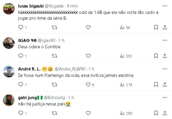 Além disso, o jogador ainda tem que cumprir uma suspensão no Campeonato Paranaense por sua participação em uma briga durante o clássico Atletiba de 2023.