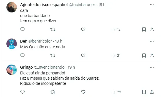 O dirigente acabou citando o uruguaio Luis Suárez, o dono da posição em 2023, mas que deixou a equipe após o fim da temporada passada. Segundo ele, é praticamente impossível encontrar um jogador com a mesma qualidade, dando um balde de água fria a respeito da atuação do Grêmio no mercado.