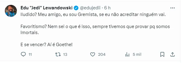 Pensando nisso, o vidente Luiz Filho, do canal no YouTube Renascer das Cartas, resolveu fazer uma previsão sobre o confronto. Segundo ele, o empate é o mais provável de acontecer. Porém, disse que o Grêmio pode aprontar.
