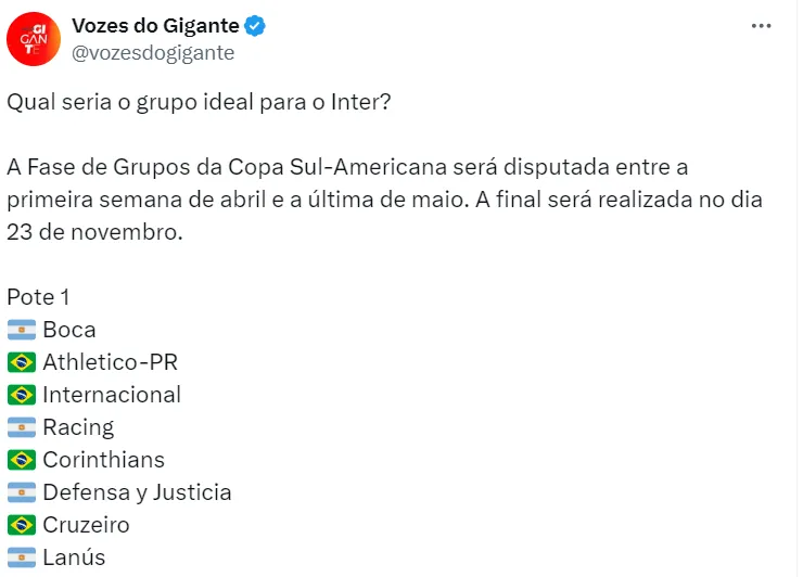 Enquanto isso, Fortaleza e Cuiabá estão nos potes 2 e 3, de forma respectiva. Além deles, o eliminado de Botafogo e Bragantino irá entrar para o pote 4 no sorteio.