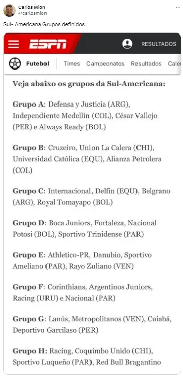 O Timão, por exemplo, ficou no grupo da morte. Enquanto isso, o Bragantino garantiu a vaga na competição após perder para o Botafogo na fase preliminar da Libertadores.