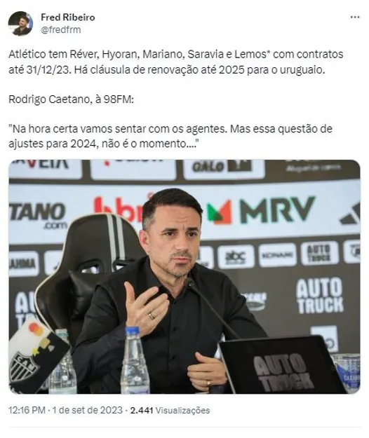 “Na hora certa vamos sentar com os agentes. Mas essa questão de ajustes para 2024, não é o momento”, declarou o dirigente, afirmando que as prioridades na Cidade do Galo estão voltadas ao desempenho dentro de campo.